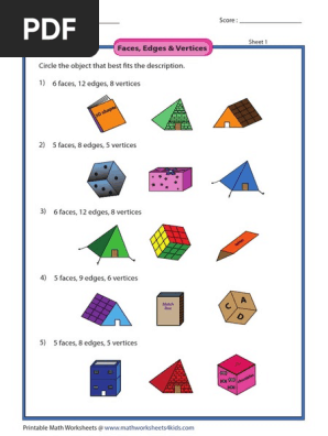 Printable math worksheets faces edges and vertices. 3d Geometric Shapes - Nets - Math Salamanders At 2nd grade we are beginning to name the shapes and count some of their faces. At 3rd grade the focus turns to identifying properties such as faces, edges and vertices. We also start investigating the links between 3d shapes and their nets. Faces, Edges, and Vertices | 3D Shapes Worksheets Begin with the printable properties of solid shapes chart, proceed to recognizing and counting the faces, edges, and vertices of each shape, expand horizons while applying the attributes to real-life objects, add a bonus with comparing attributes of different solid figures and many more pdf worksheets. Our free worksheets are a compulsive print. List of Geometric Shapes - Math Salamanders Cones have either 1 or 2 faces, 0 or 1 edges, and 1 apex (which is described by some mathematicians as a vertex). Triangular Prism. Triangular Prisms have 5 faces, 9 edges, and 6 vertices. The two faces at either end are triangles, and the rest of the faces are rectangular. Hexagonal Prism. Hexagonal Prisms have 8 faces, 18 edges, and 12 ... Printable 3D Shapes Worksheets - Math Fun Worksheets All 3- D shapes have faces, edges and vertices. The flat surfaces of the cube are called faces. A cube has 6 faces. The line segment where two faces meet are edges. A cube has 12 edges. Vertex is where three edges meet. A cube has 8 vertices. We have a number of 3- D objects around us. Almost all the things we handle are solids.